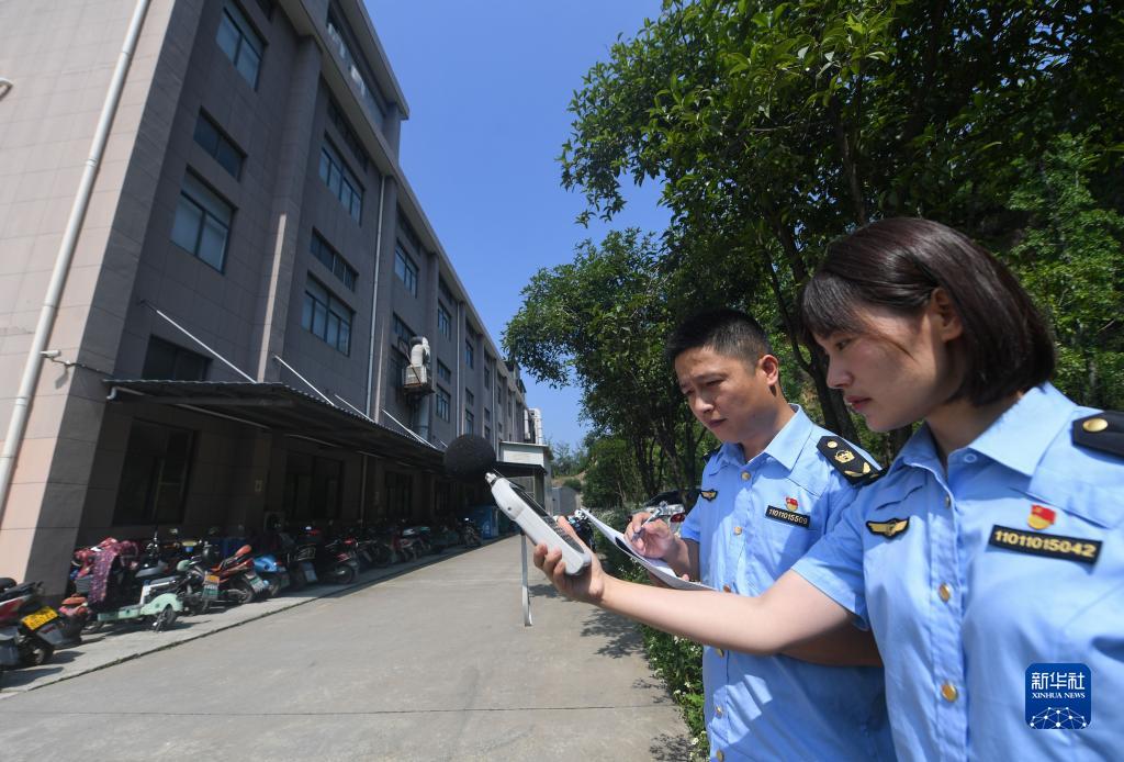 6月14日,杭州市生态环境局临安分局的工作人员用专业设备在检测厂区的环境噪音。