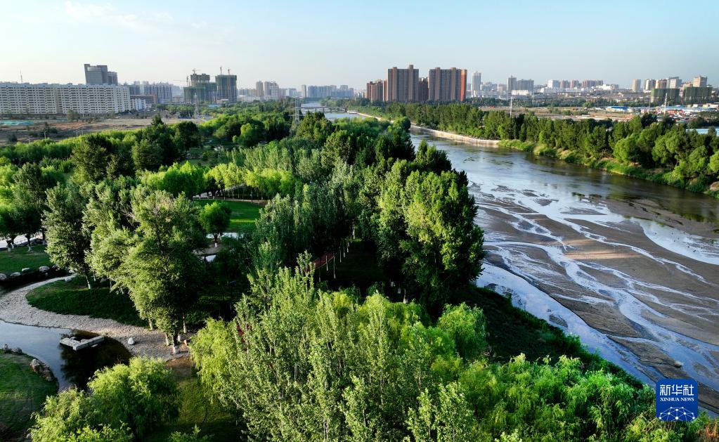 红石峡生态公园榆阳区榆溪河两岸绿树成荫(6月10日摄,无人机照片)。