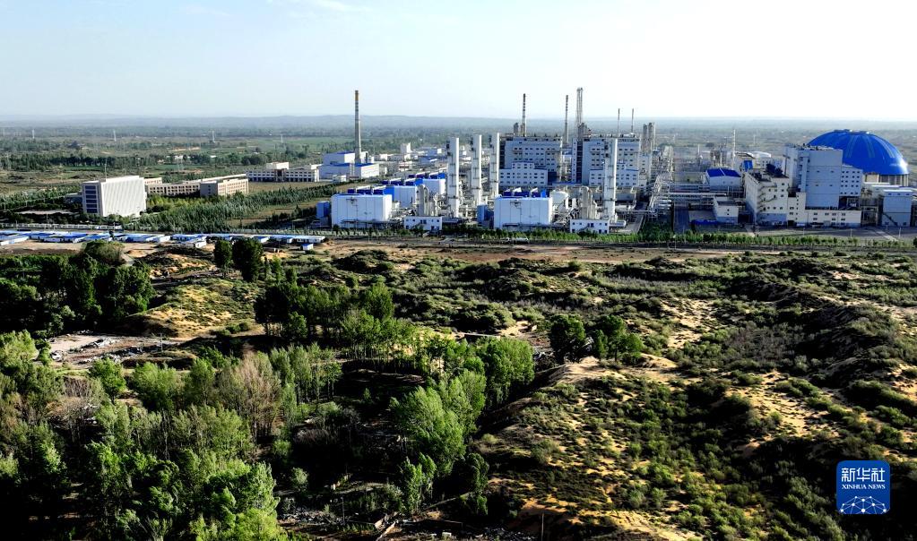 大漠中的陕西未来能源化工有限公司(6月13日摄,无人机照片)。该公司通过购买榆阳区小纪汗林场2527吨碳票,实现碳达峰、碳中和目标。