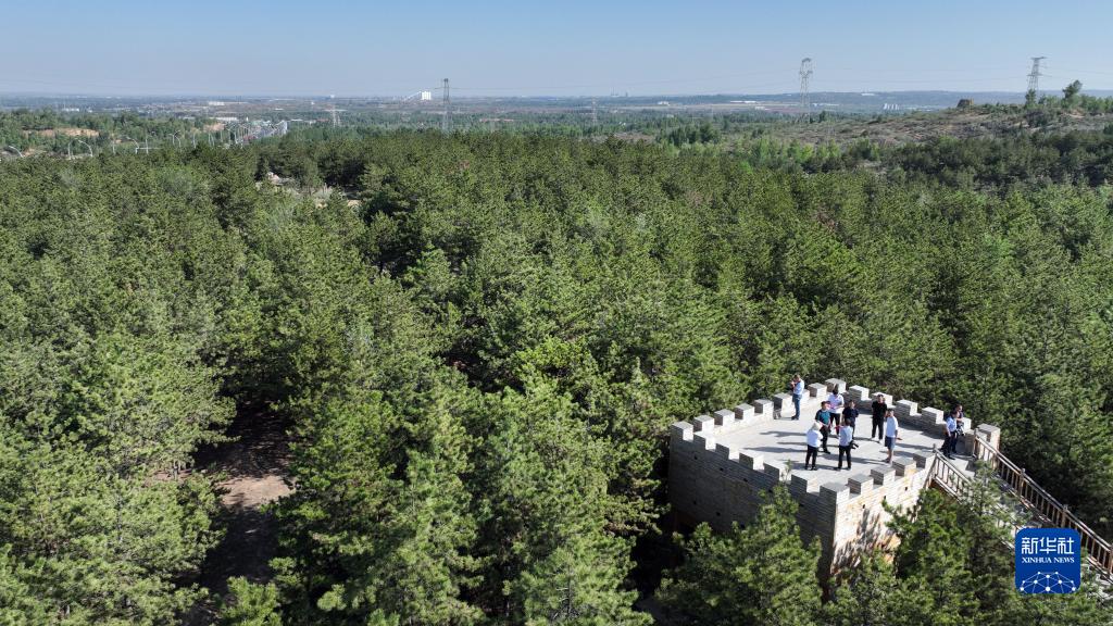 游人在榆林市榆阳区牛家梁林场七里沙工区观景台参观(6月10日摄,无人机照片)。