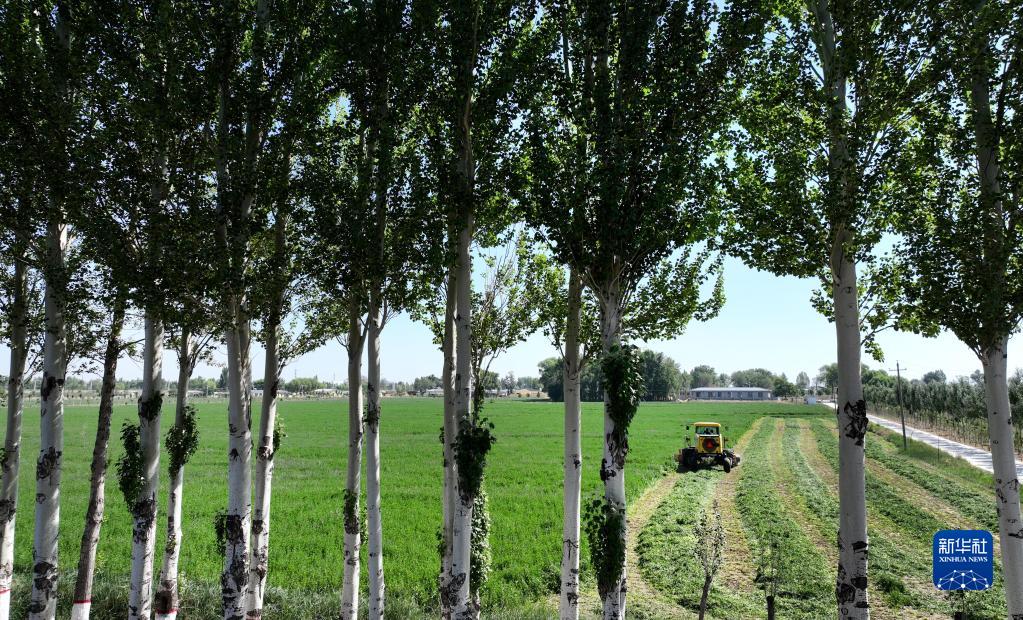 大型农机在榆林市榆阳区金鸡滩村收割紫花苜蓿(6月10日摄)。