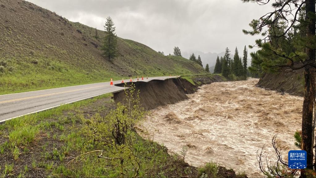 美国国家公园管理局6月13日发布的照片显示黄石国家公园东北入口的洪水和受损道路。