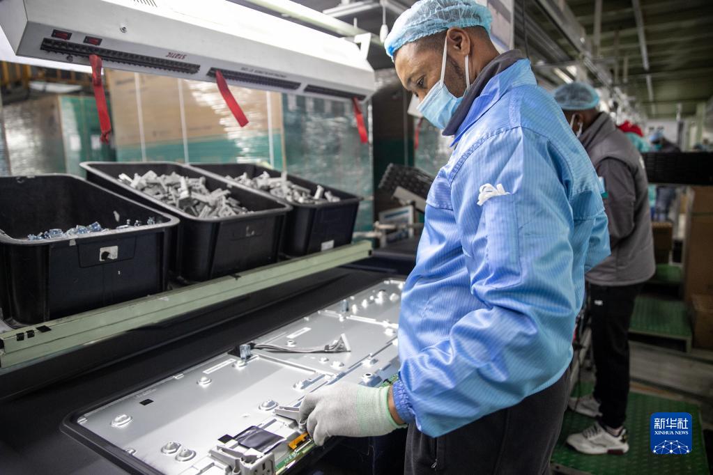 6月1日,当地员工在南非开普敦海信南非工业园的电视机生产线上工作。