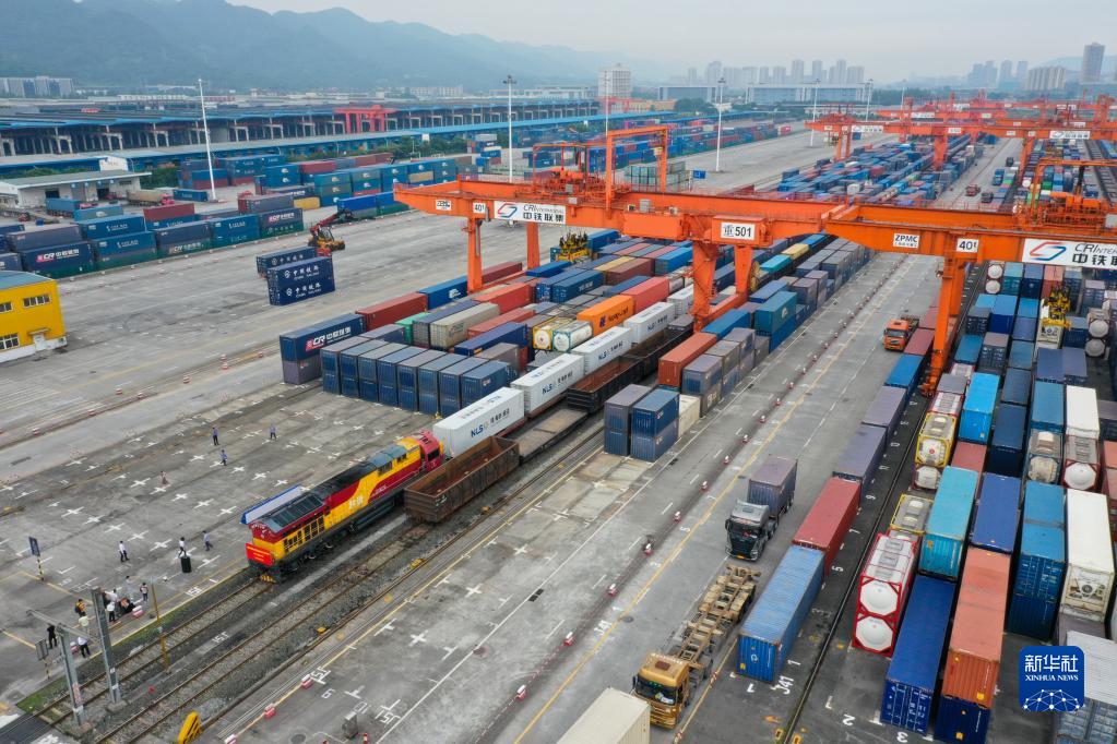 6月16日,西部陆海新通道国际联运测试班列(重庆-西藏-南亚)在重庆团结村中心站等候发车(无人机照片)。