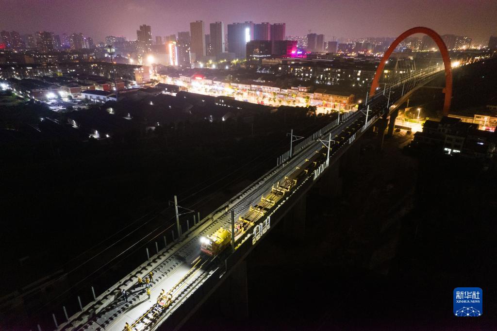 6月18日凌晨,在常益长铁路常益段无砟轨道铺设现场,一辆500米长轨运输车正在作业(无人机照片)。