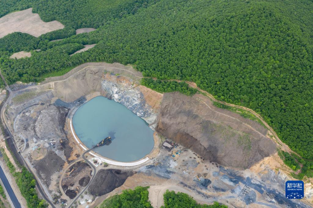 6月17日拍摄的正在施工的翡翠湖矿坑森林公园项目工地(无人机照片)。