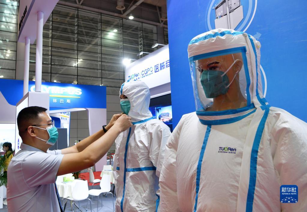 6月18日,工作人员在第二十届中国·海峡创新项目成果交易会上整理展示的医用正压防护服。