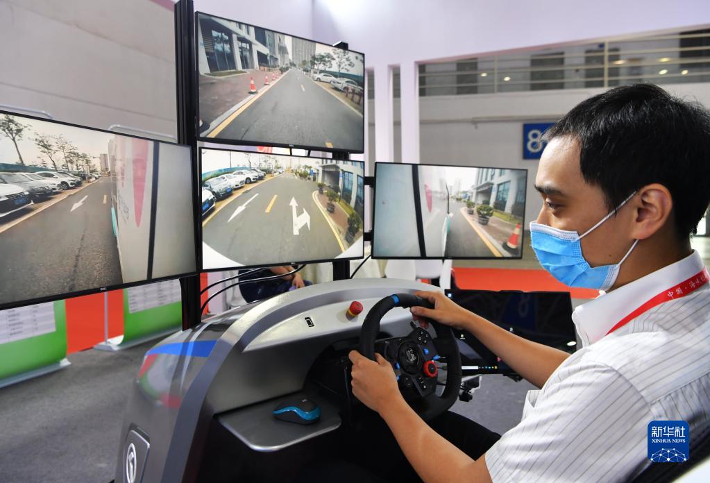 6月18日,参展工作人员在演示操作5G智慧远程驾驶舱。