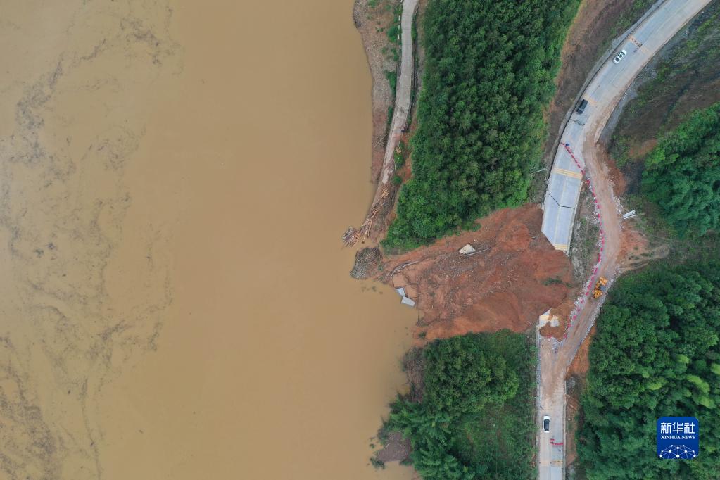 6月19日,在广西融水苗族自治县四荣乡,工作人员在抢修道路(无人机照片)。新华社记者 黄孝邦 摄