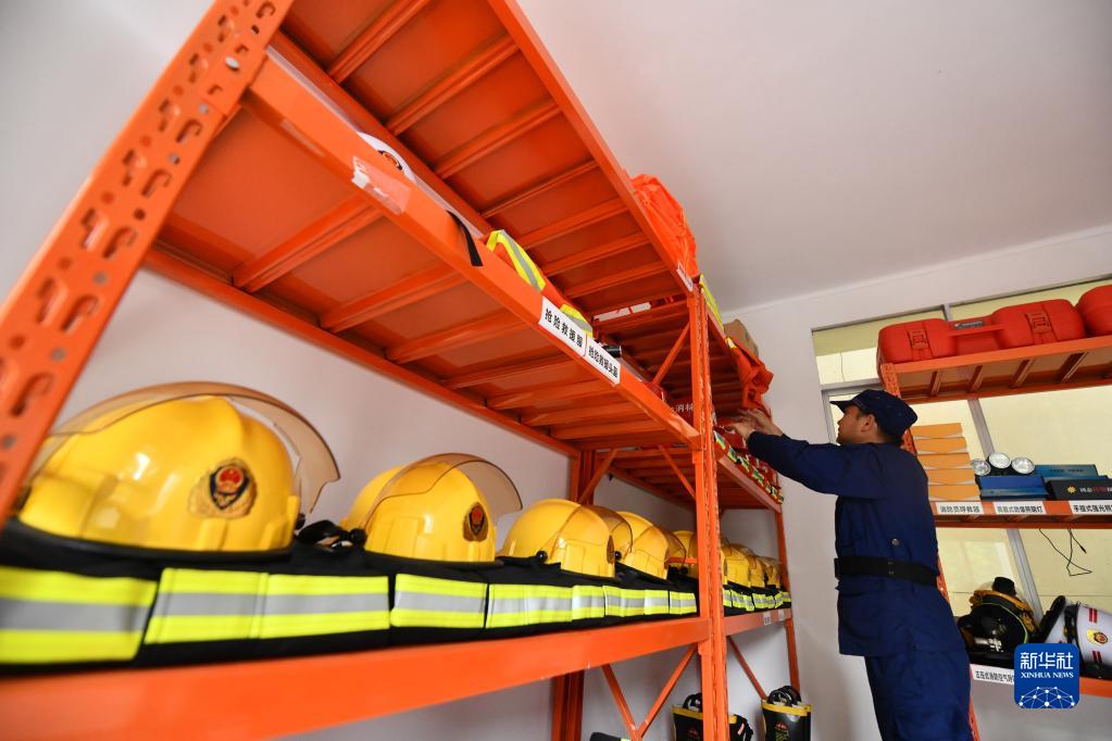 6月20日,融水苗族自治县香粉乡专职消防救援队队长林晴在整理救援装备。