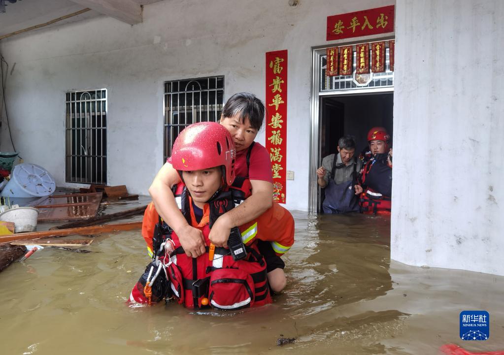 6月21日,在广东韶关市曲江区樟市镇铁厂村,消防救援人员转移被困群众。