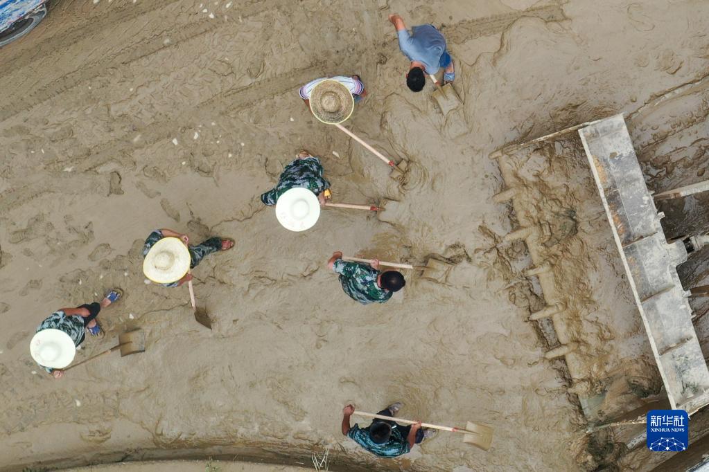 6月21日,工作人员在清理榕江县城路面上的淤泥(无人机照片)。