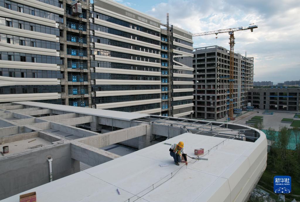 6月21日,工人在西安市红会医院高铁新城院区项目作业(无人机照片)。