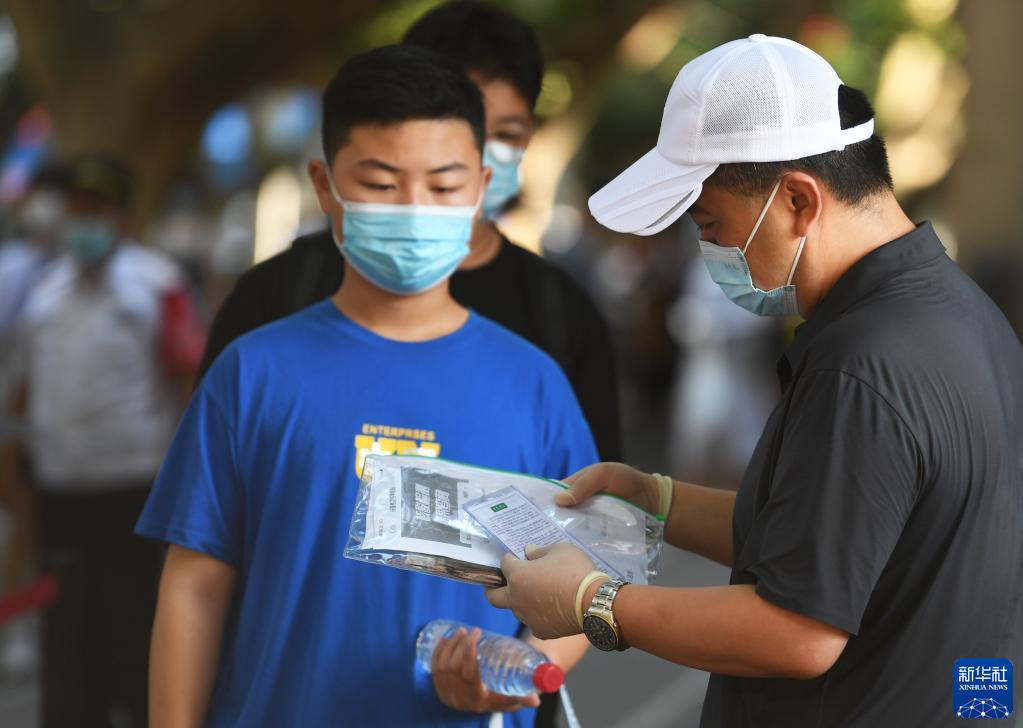 6月22日,在河南省郑州市第八中学考点,工作人员(右)检查考生证件。