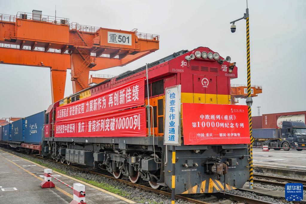 当日,第10000列中欧班列(重庆)满载着100个标箱的电子产品、机械零件、日用百货等货物,从重庆团结村中心站顺利驶出,一路向西,奔赴一万余公里外的德国杜伊斯堡。重庆成为全国首个累计重箱折列开行量突破 10000 列的中欧班列开行城市。