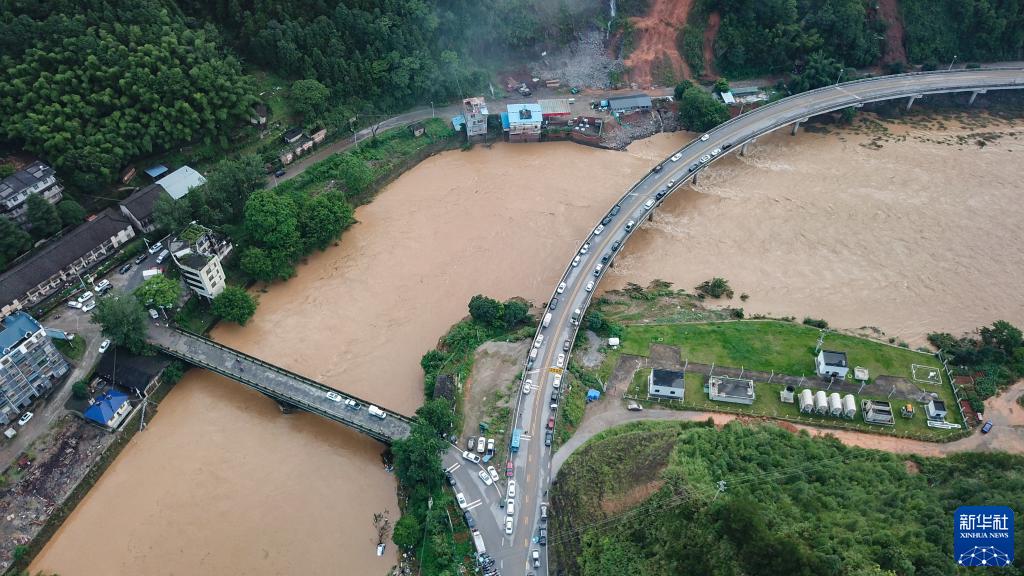 湖南永州市江华瑶族自治县码市镇旁边的河流水位较高(6月22日摄,无人机照片)。近日,受持续性强降雨影响,湖南省永州市多地出现洪水内涝、山体滑坡、农田被淹等情况。当地积极开展抗洪救灾,争取将损失降到最低。新华社记者 陈泽国 摄