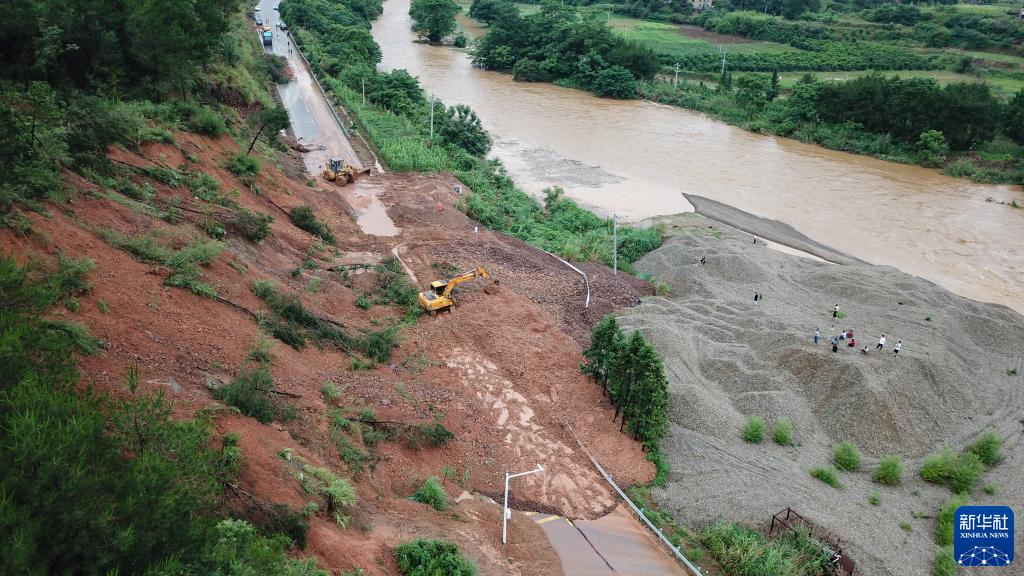 在湖南永州市江华瑶族自治县码市镇,工作人员驾驶车辆处理山体滑坡(6月22日摄,无人机照片)。近日,受持续性强降雨影响,湖南省永州市多地出现洪水内涝、山体滑坡、农田被淹等情况。当地积极开展抗洪救灾,争取将损失降到最低。新华社记者 陈泽国 摄