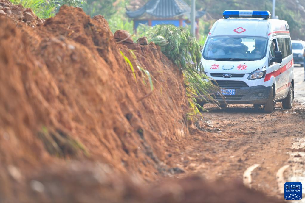 在湖南永州市江华瑶族自治县码市镇,救护车在一处山体滑坡旁待命(6月22日摄)。近日,受持续性强降雨影响,湖南省永州市多地出现洪水内涝、山体滑坡、农田被淹等情况。当地积极开展抗洪救灾,争取将损失降到最低。新华社记者 陈泽国 摄