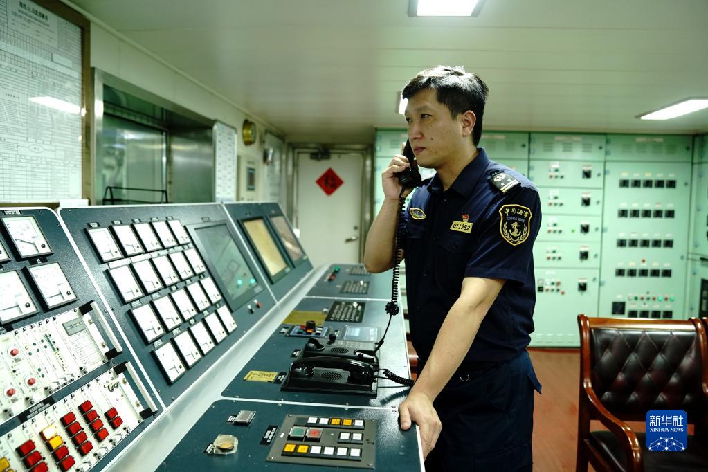 6月22日,“海巡01”轮轮机长穆长城在机舱集控室与驾驶台进行联络。