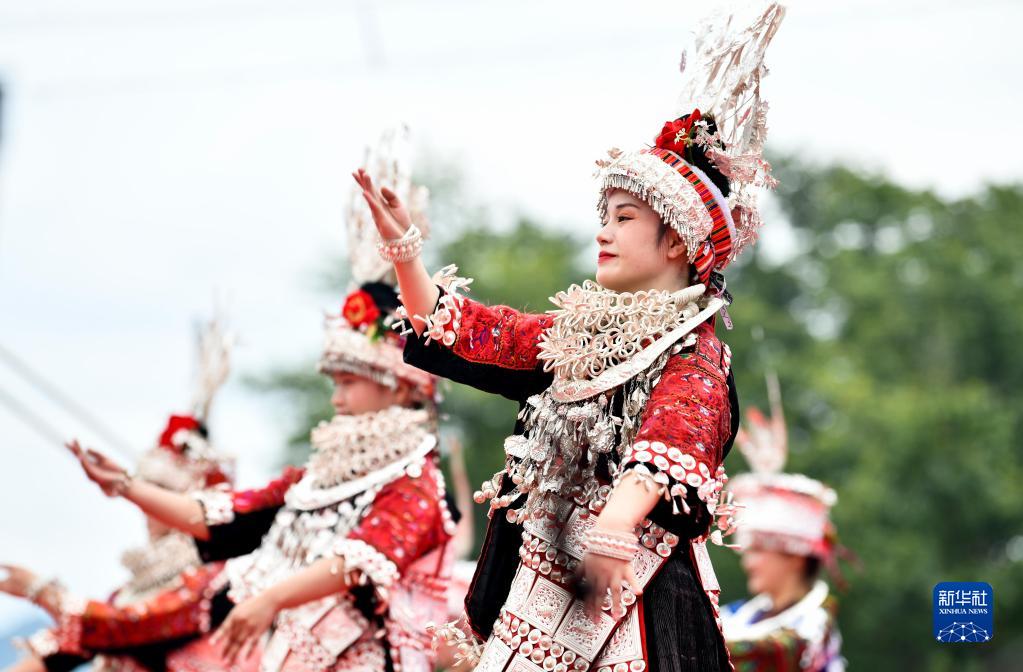 6月23日,在贵州省台江县施洞苗族独木龙舟节开幕式上,苗族姑娘表演民族舞蹈。
