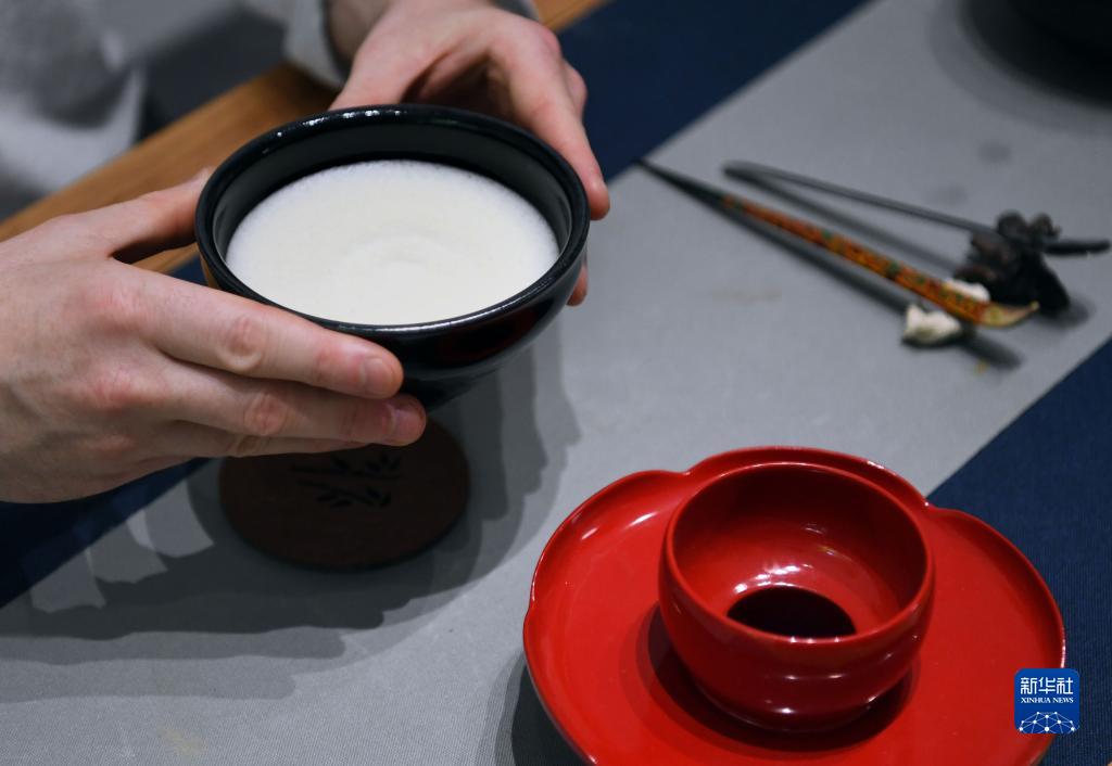 大卫完成点茶后,将茶盏放上茶托(6月22日摄)。