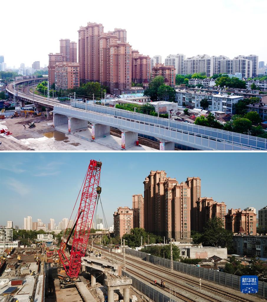 拼版照片:上图为中铁十局承建的济郑高铁引入济南枢纽工程京胶联络上行线北—北特大桥顺利完成桥梁改造(6月25日摄,无人机照片);下图为在济郑高铁引入济南枢纽工程京胶联络上行线北—北特大桥,工作人员进行桥梁吊拆施工(5月17日摄,无人机照片)。