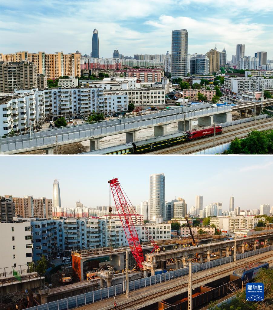 拼版照片:上图为中铁十局承建的济郑高铁引入济南枢纽工程京胶联络上行线北—北特大桥顺利完成桥梁改造(6月25日摄,无人机照片);下图为在济郑高铁引入济南枢纽工程京胶联络上行线北—北特大桥,工作人员进行桥梁吊拆施工(5月17日摄,无人机照片)。
