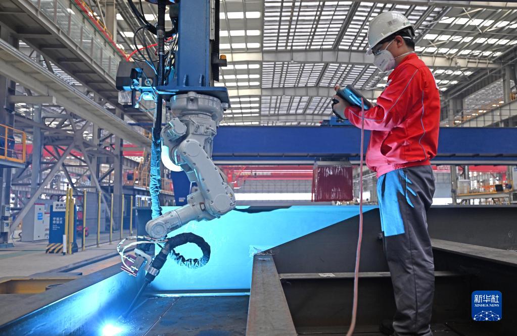 6月26日,在海油工程天津智能化制造基地结构预制车间内,工作人员在操作焊接机器人。新华社记者 赵子硕 摄
