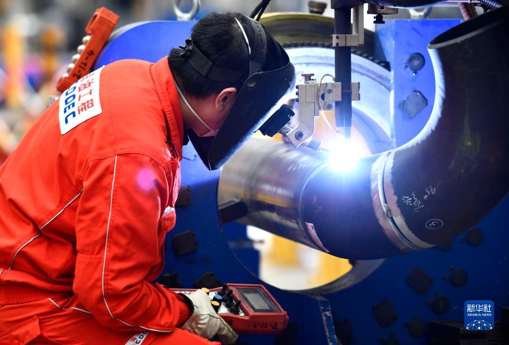 6月26日,在海油工程天津智能化制造基地工艺管线预制车间内,工作人员在操作自动组对焊接一体化设备。新华社记者 赵子硕 摄