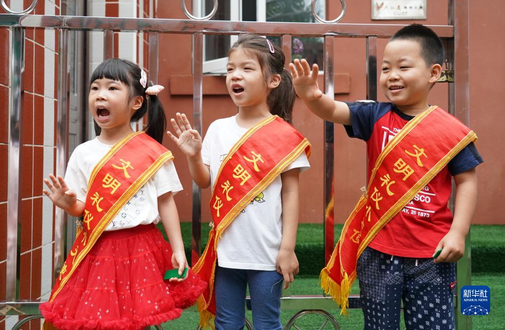 7月4日,在中国科学院第三幼儿园,“文明礼仪小天使”欢迎小朋友的到来。