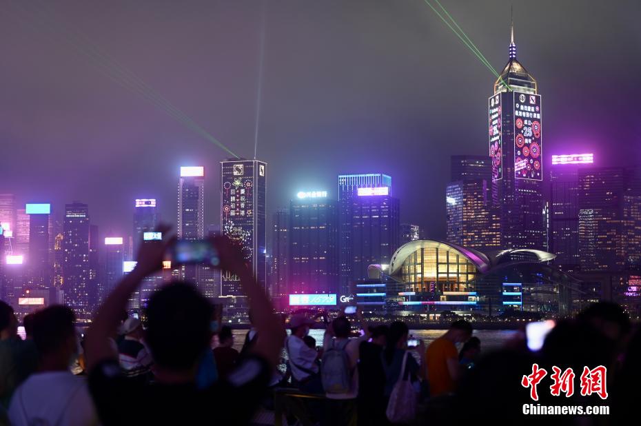 为庆祝香港回归祖国25周年,香港旅游发展局推出“幻彩咏香江”特别版之“维港光影汇演”。7月4日晚,大批市民于尖沙咀观看“维港光影汇演”。该光影汇演于维港两岸逾50座大厦及地点共同打造以“香港新征程”为主题的音乐光影汇演,活动增添特别灯效及大厦LED屏幕和幕墙影像等元素,为观赏市民提供耳目一新的视听享受。李志华 摄