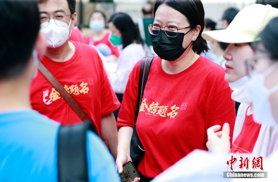 7月7日,送考老师身穿印有“金榜题名”字样的T恤为学生加油打气。当日,因疫情延期的2022年上海市普通高等学校招生统一文化考试正式拉开大幕,5万多名考生迎来人生中重要的一次考试。 中新社记者 汤彦俊 摄