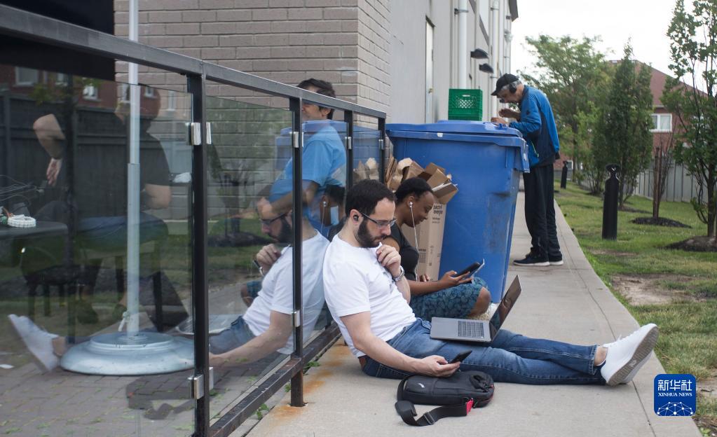 7月8日,人们在加拿大安大略省米西索加一处咖啡店外“蹭”网。