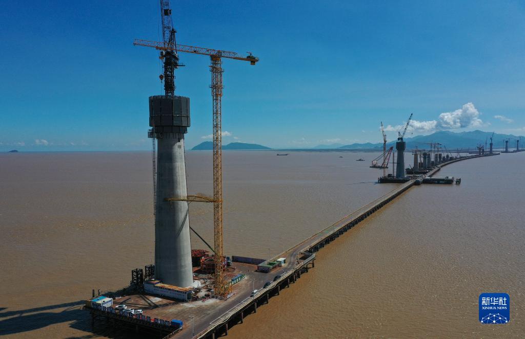 建设中的黄茅海跨海通道高栏港大桥东主塔(前)(无人机照片,7月12日摄)。