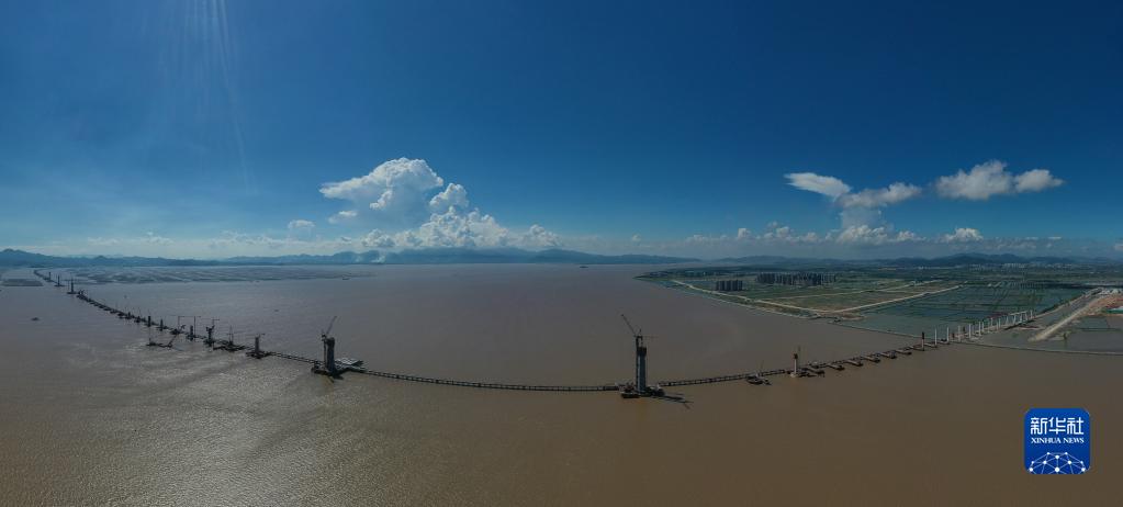 建设中的黄茅海跨海通道高栏港大桥东主塔(右)(无人机全景照片,7月12日摄)。