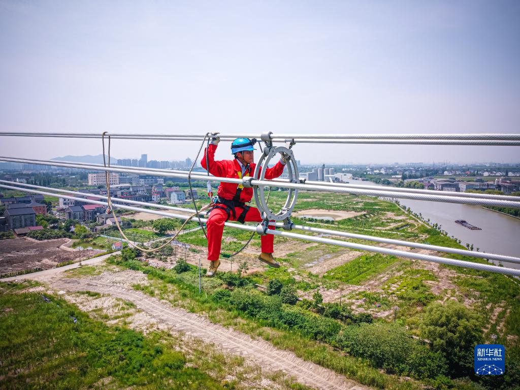7月12日,电力工人对新建设完成的白鹤滩—浙江特高压直流输电工程线路进行走线验收工作(无人机照片)。 新华社记者 江汉 摄