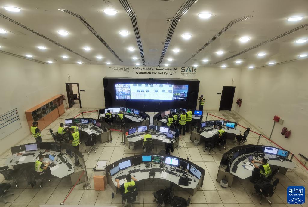 7月6日,在沙特阿拉伯麦加,轻轨运营工作人员在项目运营控制中心工作。新华社发(中国铁建供图/韩晓林摄)