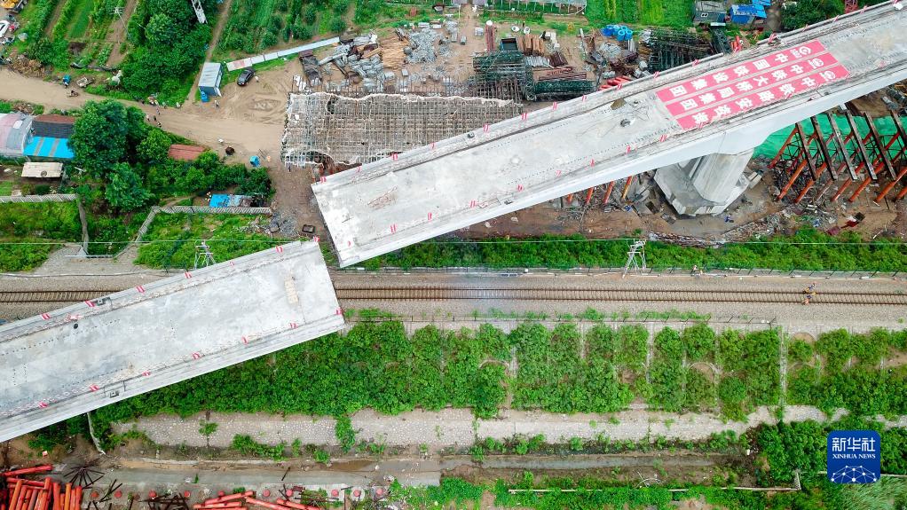 7月13日,在山东省龙口市,中铁大桥局的工作人员在对潍烟高铁跨龙烟铁路126米连续梁双“T”构进行同时转体作业(无人机照片)。