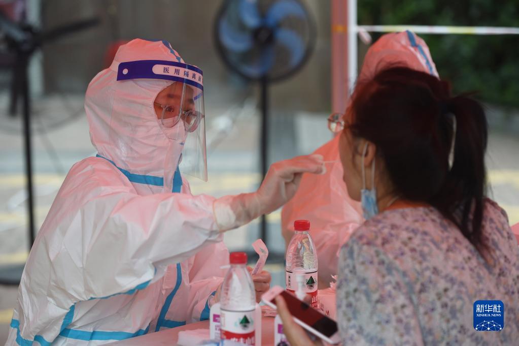 7月17日,在蚌埠市龙子湖区一小区,医务人员为居民进行核酸采样。