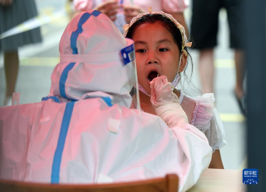 7月16日,在蚌埠市蚌山区和平社区,医务人员为居民进行核酸采样。