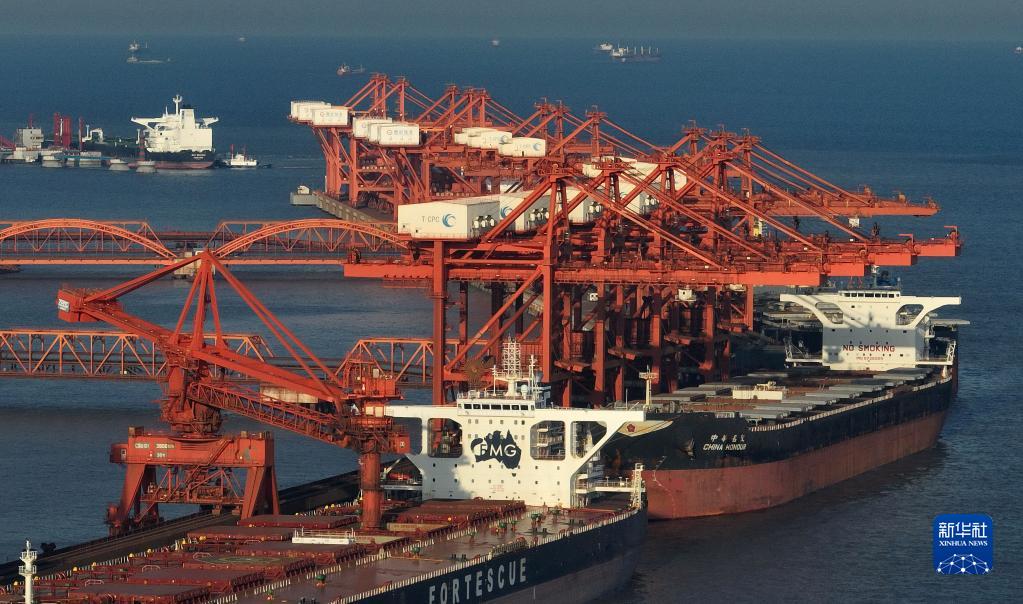 两艘轮船靠泊在唐山港曹妃甸港区矿石码头卸货(7月18日摄,无人机照片)。