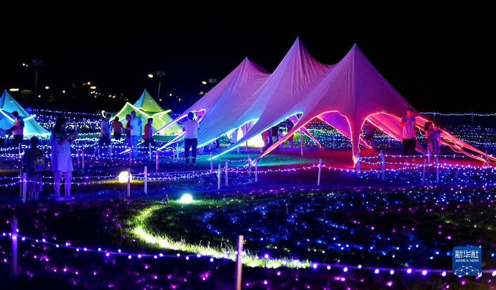 游客在长安唐村内观看光影秀(7月23日摄)。