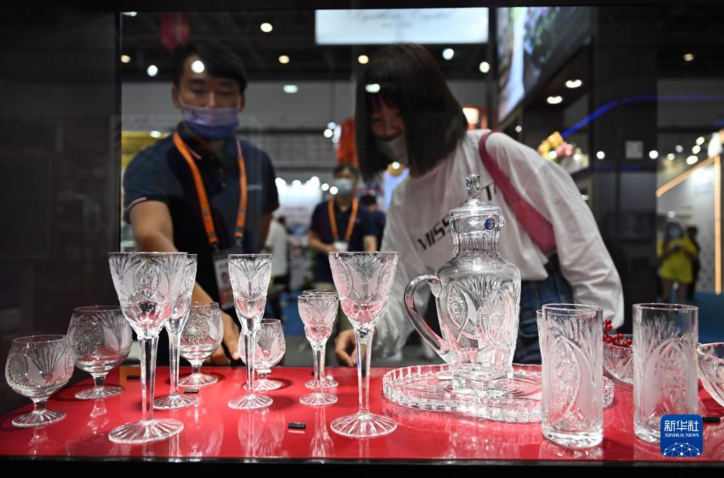 7月27日,观众在消博会迪亚斯科沃水晶生活馆选购水晶餐饮具。