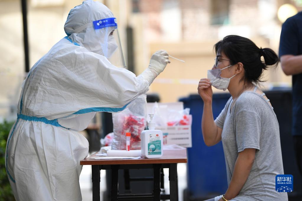 7月27日,医护人员在兰州市城关区一小区为居民进行核酸检测。