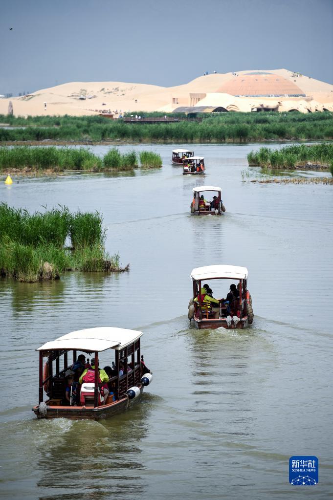 游客在宁夏沙湖景区乘坐游船观鸟游览(2019年6月6日摄)。