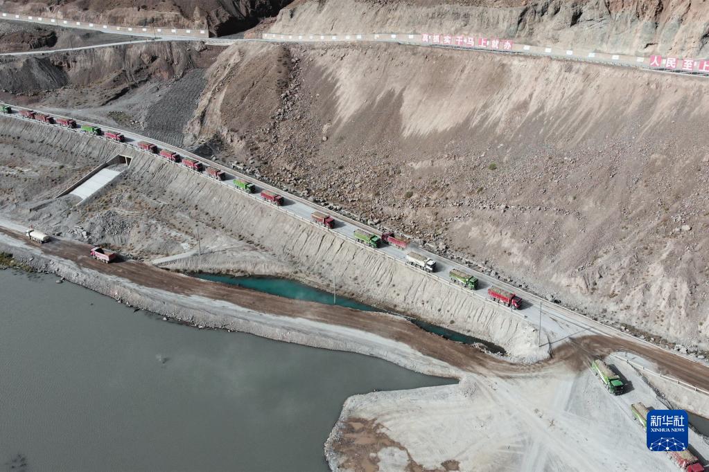 7月27日,为新疆大石峡水利枢纽工程运送填筑物料的车队排成一条“长龙”(无人机照片)。