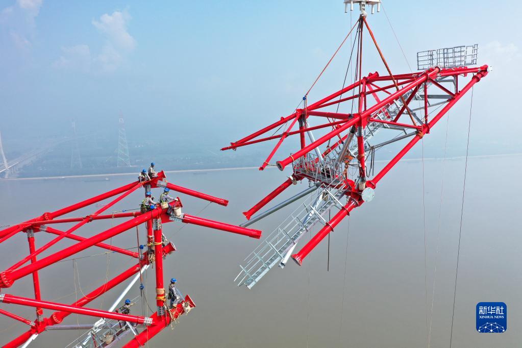 8月1日,安徽送变电工程有限公司施工人员在池州长江大跨越南岸跨越塔封顶施工现场作业(无人机照片)。