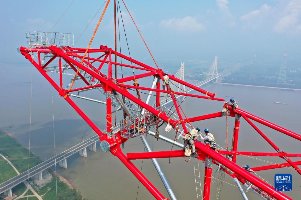 8月1日,安徽送变电工程有限公司施工人员在池州长江大跨越南岸跨越塔封顶施工现场作业(无人机照片)。