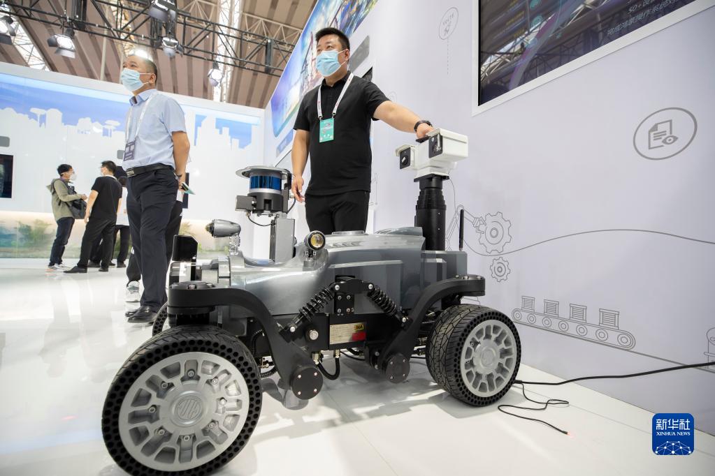 8月11日,在2022世界5G大会展厅里,参展商介绍5G网络支持下的矿上巡检机器人。
