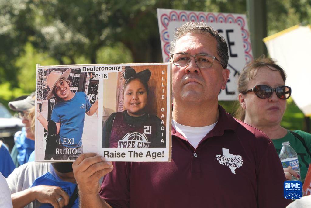 当日,包括得州小学枪击案遇难者亲属在内的抗议者在奥斯汀市举行集会呼吁控枪。5月24日发生在得州尤瓦尔迪市罗布小学的枪击案造成19名小学生和两名教师死亡,震动全美。